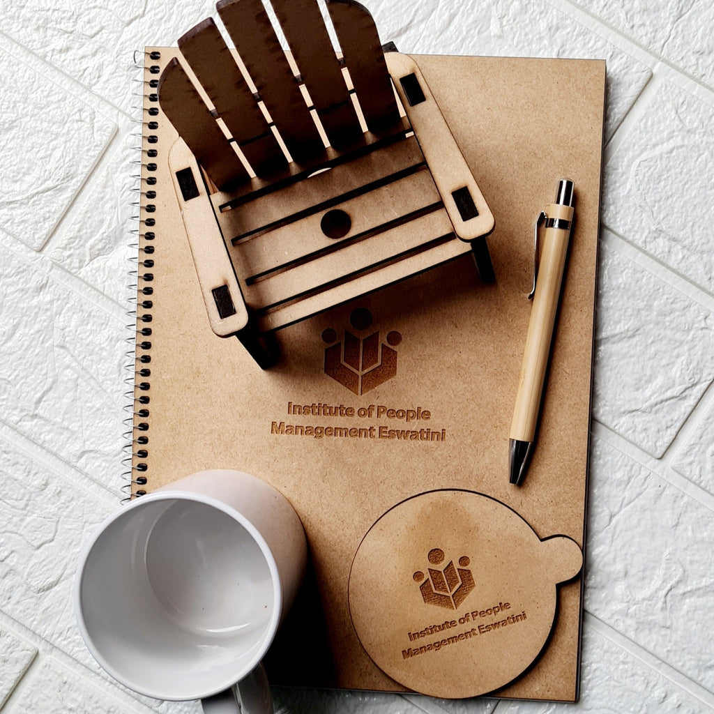 This combo consists of a branded Magic Coffee mug, A branded wooden A4 64 paged, Personalized Bamboo pen, a personalized coaster and a wooden Chair phone stand.